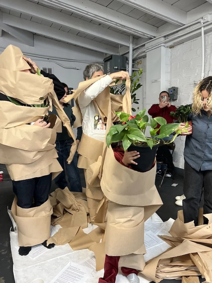 Each participant reads a portion of their displacement story as the others cover them in paper, silencing them, but their favorite plant emerges from the paper, and eventually they all break free and recite the rest of their stories in a strong chorus of multi-language voices.
